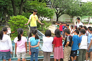 学校での環境学習の一環として授業を行います。また、年間を通した総合学習としてビオトープを利用したプログラムの作成・実施なども行います。